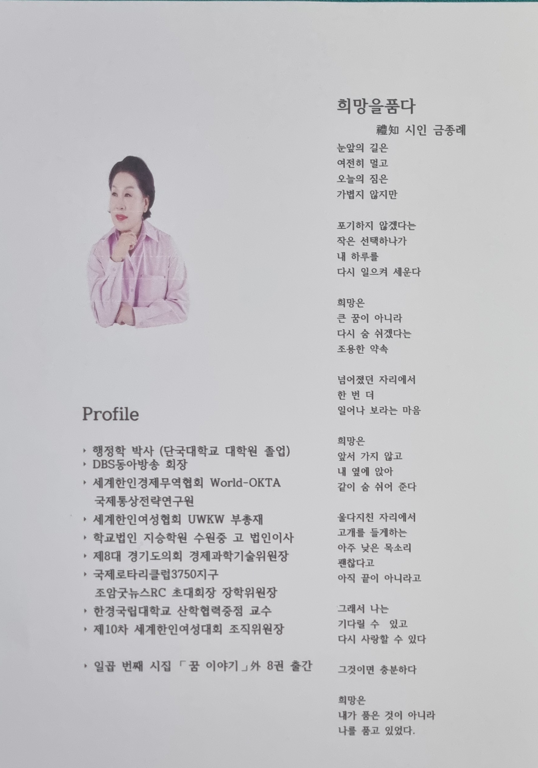 2026년 새해를 여는 신년서시로 금종례 시인의 시 ‘희망을 품다’가 조용한 울림을 전하고 있다. 이 시는 거창한 결심이나 거대한 꿈 대신, 다시 숨 쉬겠다는 작은 다짐에서 출발해 오늘을 살아가게 하는 힘이 무엇인지를 묻는다.