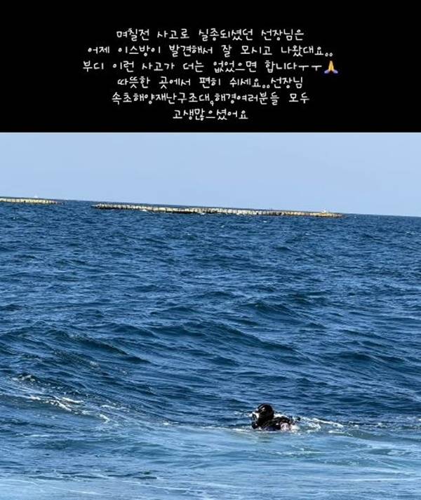 하재숙은 9일 자신의 SNS를 통해 “며칠 전 사고로 실종되셨던 선장님은 어제 이서방(남편)이 발견해서 잘 모시고 나왔다”고 밝혔다. 이어 “이런 사고가 더는 없었으면 한다. 따뜻한 곳에서 편히 쉬시길 바란다”고 애도의 뜻을 전했다. 또 구조 작업에 나선 속초 해양 재난구조대와 해경 관계자들에게 감사의 메시지를 남겼다.