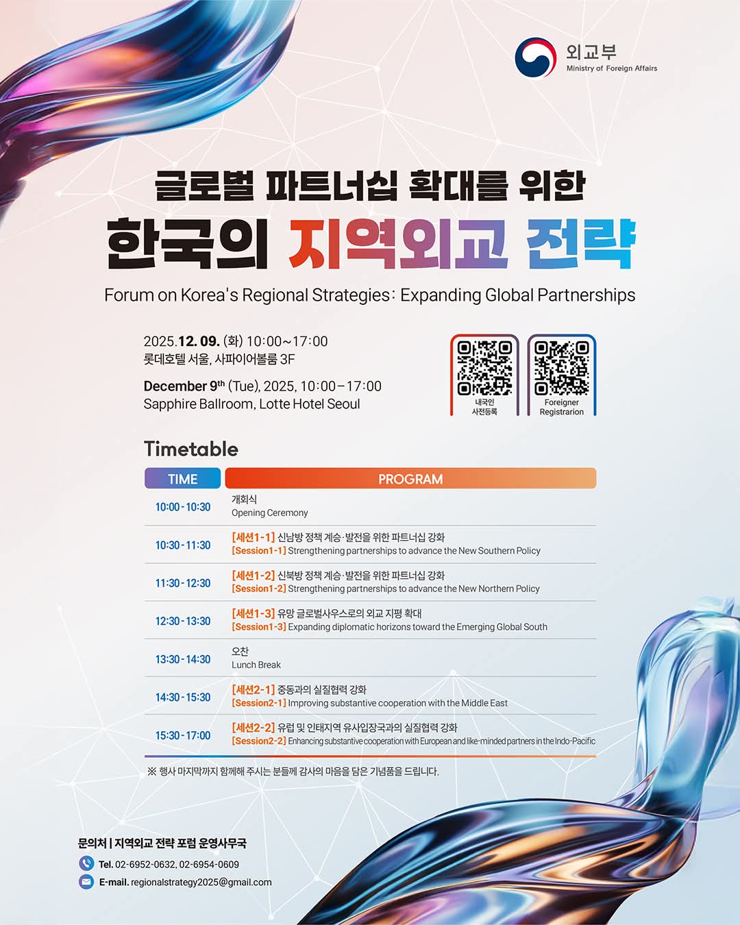 외교부가 12월 9일 서울 롯데호텔 사파이어볼룸에서 ‘글로벌 파트너십 확대를 위한 한국의 지역외교 전략 포럼’을 연다. 행사는 오전 10시부터 오후 5시까지…
