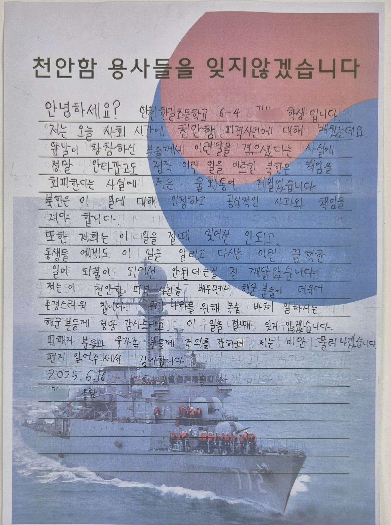인천 소재 초등학교 6학년 학생들이 호국보훈의 달을 맞아 천안함 생존 장병들에게 위문 편지를 보내 잔잔한 감동을 주고 있다. 학생 20여…