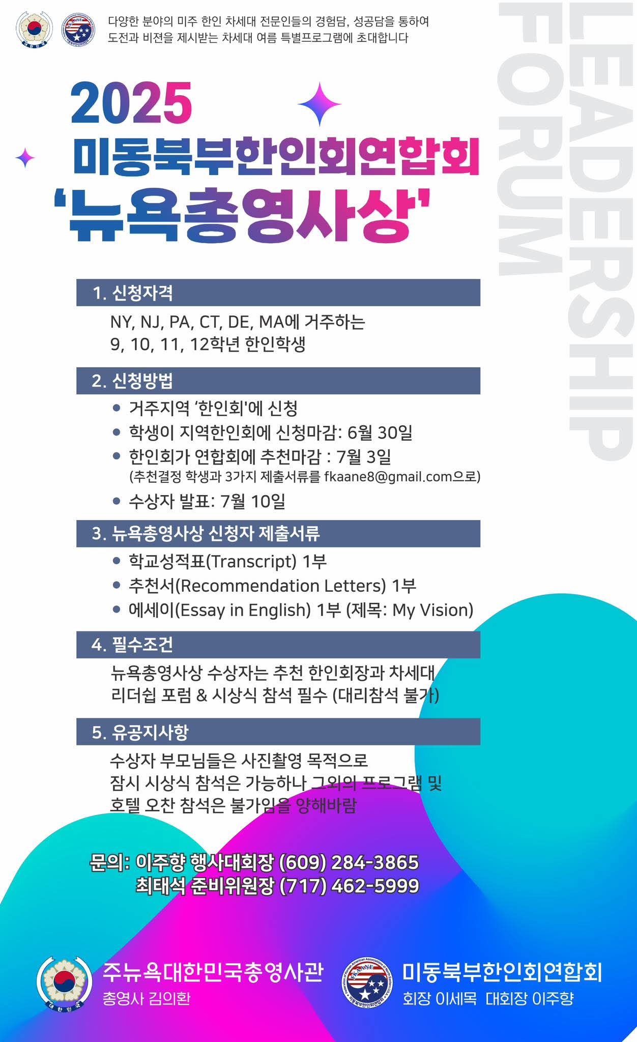 미동북부한인회연합회가 주뉴욕대한민국총영사관과 함께 차세대 리더 육성을 위한 ‘2025 뉴욕총영사상’ 수상 후보자를 모집한다. 지원 자격은 뉴욕(NY), 뉴저지(NJ), 펜실베이니아(PA), 코네티컷(CT), 델라웨어(DE), 매사추세츠(MA)에…