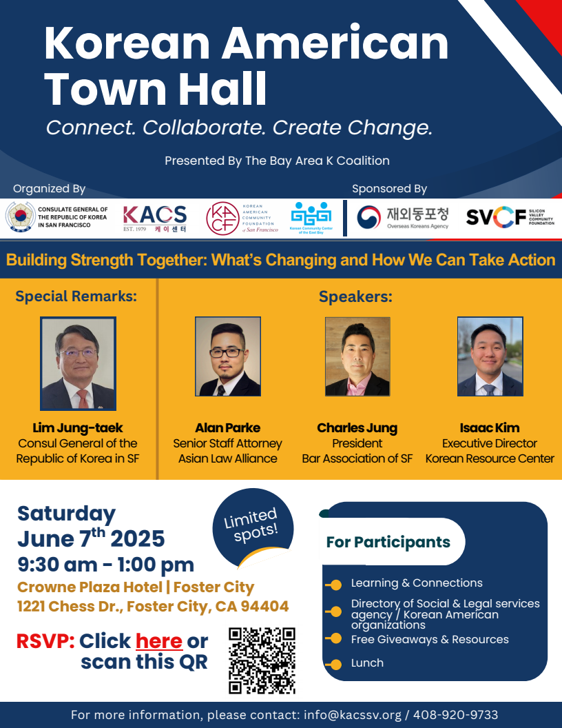 베이한인연합은 주샌프란시스코총영사관과 함께 재외동포청의 후원을 받아 오는 6월 7일(토) 오전 10시, 포스터 시티 크라운 플라자 호텔(Crowne Plaza)에서 ‘2025 한인 타운홀…
