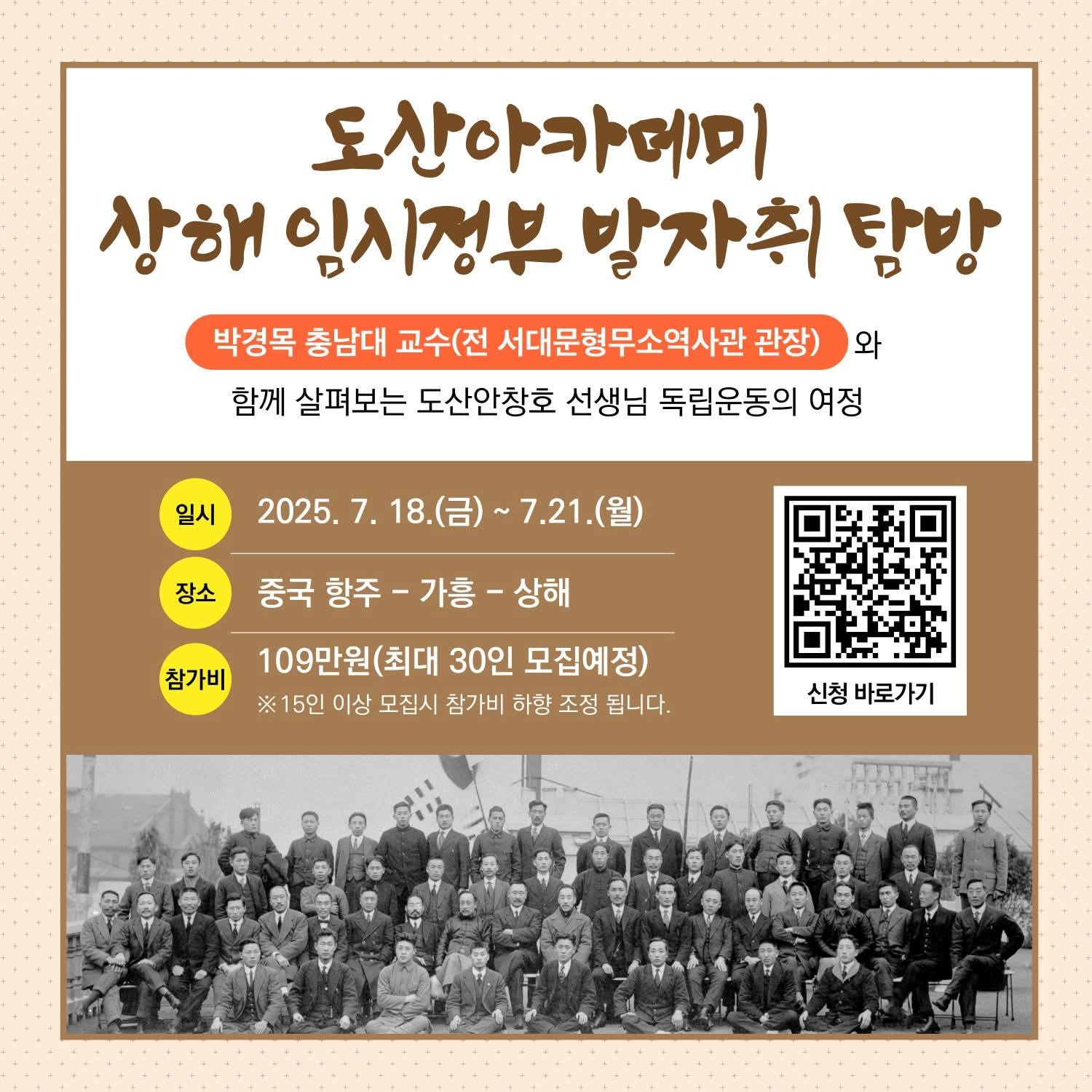 도산 안창호 선생의 독립운동 발자취를 현장에서 되새기는 탐방 프로그램이 마련됐다. 충남대학교 박경목 교수(전 서대문형무소역사관장)가 이끄는 ‘도산아카데미 상해 임시정부 발자취 탐방’이…