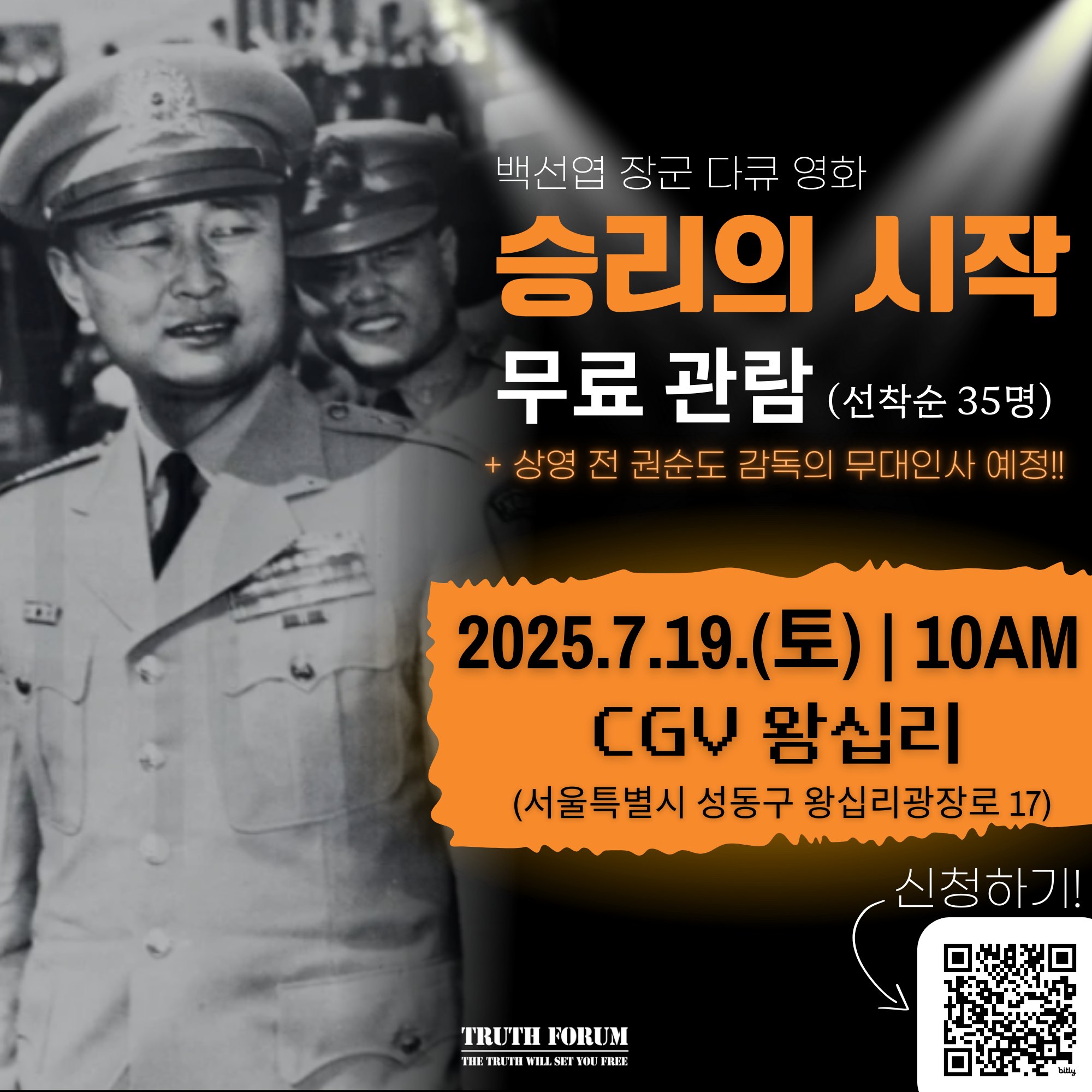 영화 승리의 시작이 오는 7월 19일(토) 오전 10시, 서울 왕십리 CGV에서 특별 무료 상영된다. 이번 상영은 트루스포럼 주관으로, 백선엽 장군의…