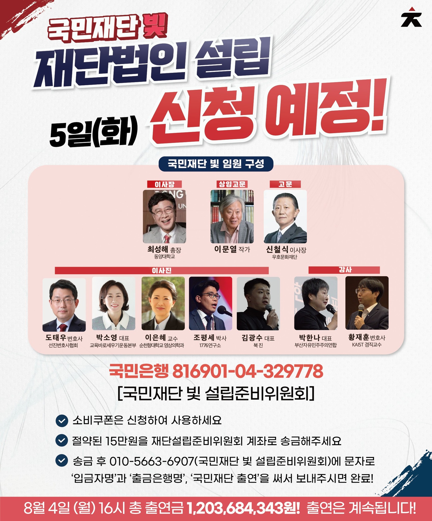 대한민국 국민과 미래세대에 ‘빛’을 전한다는 기치를 내건 ‘국민재단 빛’이 2025년 8월 5일(화) 주무관청인 서울시에 재단법인 설립 허가 신청서를 제출한다. 전국민…
