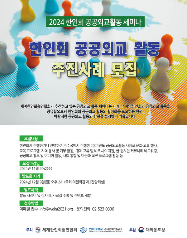 사단법인 세계한인회총연합회(약칭 ‘세한총연’, 회장 고상구)가 전 세계 한인회를 대상으로 ‘2024 공공외교활동’ 사례를 11월 20일(수)까지 모집한다. 이번 사례 모집은 세한총연이 오는…