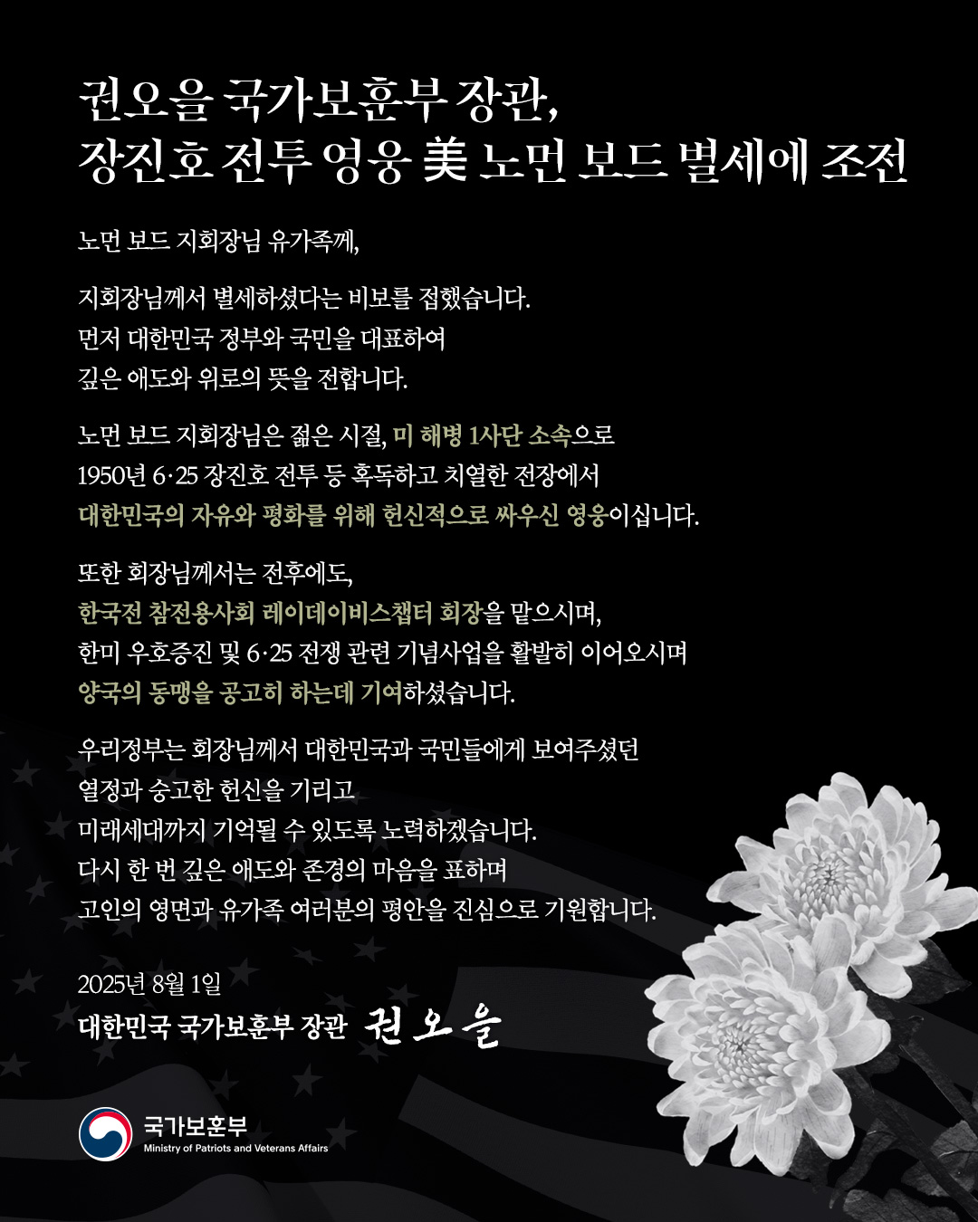 미국 로아노크 출신 노먼 프랭클린 보드 한국전 참전용사회 조지아주 레이 데이비스 챕터 회장이 7월 29일 향년 93세로 별세했다. 보드 회장은…