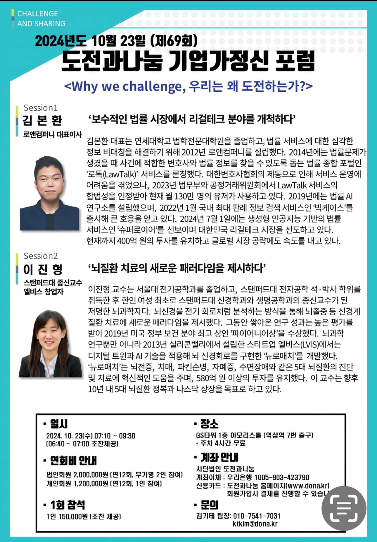 오는 2024년 10월 23일, 제69회 도전과나눔 기업가정신 포럼이 ‘Why we challenge, 우리는 왜 도전하는가?’라는 주제로 열린다. 이번 포럼에서는 각 분야에서…