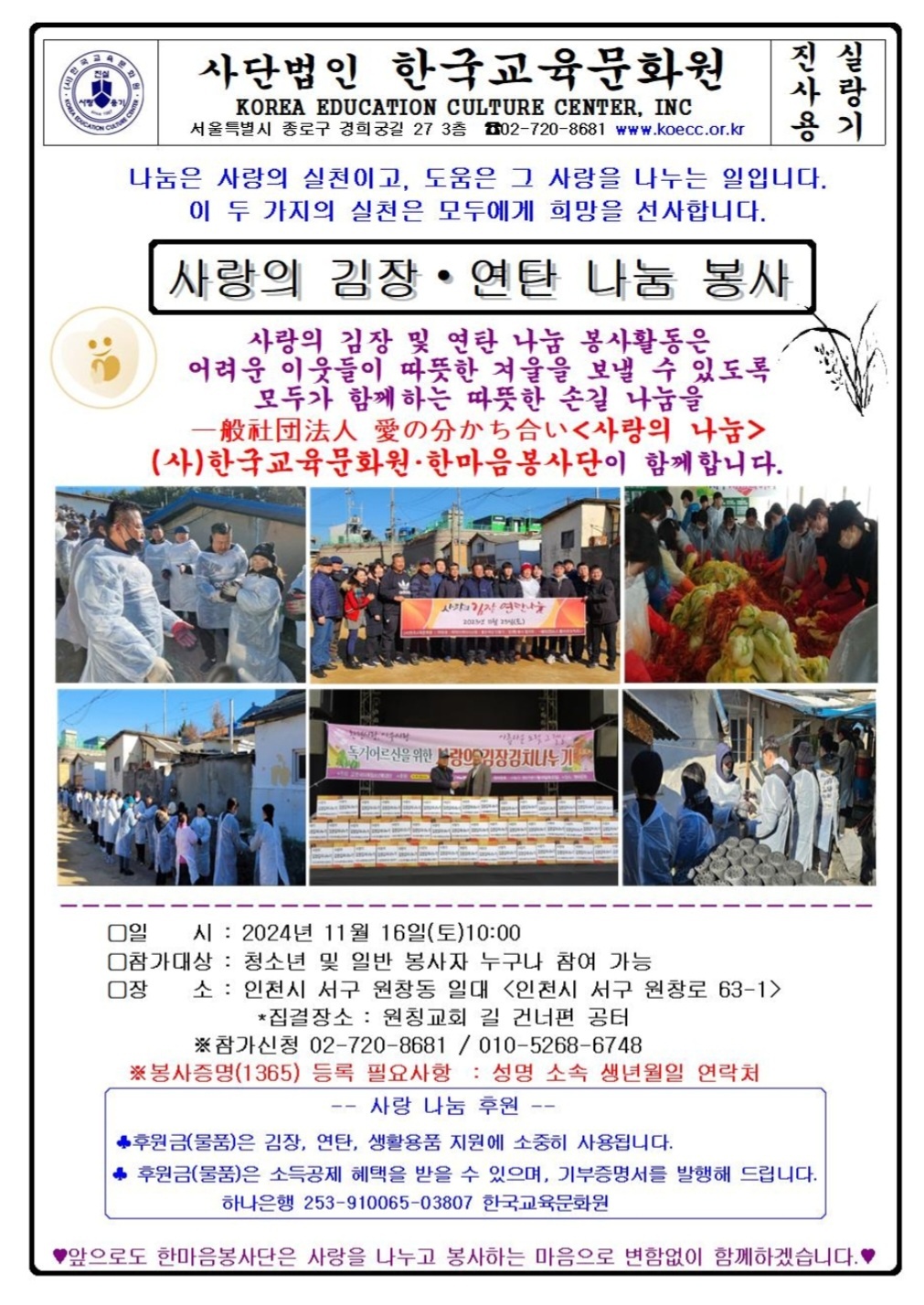 일본 사람들의 나눔 활동이 한국의 사단법인 한국교육문화원과 한마음봉사단과 협력하여 진행된다. 오는 2024년 11월 16일, 인천시 서구 원창동 일대에서 ‘사랑의 김장・연탄…