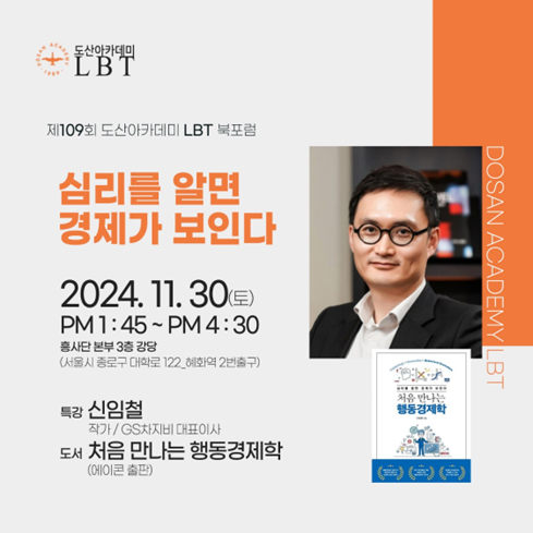 ‘처음 만나는 행동경제학’ 도서로 신임철 저자(GS 차지비 대표이사) 특강 도산아카데미가 오는 11월 30일(토)에 신임철 저자를 모시고 그의 저서 ‘처음 만나는…