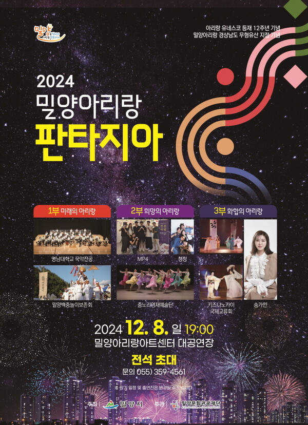 밀양문화관광재단(대표이사 이치우)은 오는 8일 오후 7시 밀양아리랑아트센터 대공연장에서 ‘2024 밀양아리랑 판타지아’ 공연을 개최한다고 밝혔다. 이번 공연은 아리랑이 유네스코에 등재된 2012년…