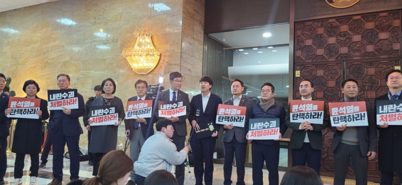 이준석 개혁신당 의원이 6일 국회 본청 제2회의장 앞에서 더불어민주당 의원들과 함께 윤석열 대통령 탄핵을 촉구하며 규탄대회에 참여했다. 이 의원은 국민의힘…