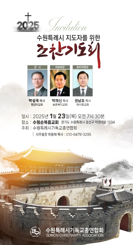 2025년 1월 23일 오전 7시 30분, 수원특례시기독교총연합회 주최로 ‘수원특례시 지도자를 위한 조찬기도회’가 수원순복음교회(경기도 수원시 권선구 덕영대로 1334)에서 개최됐다. 이번 기도회는…