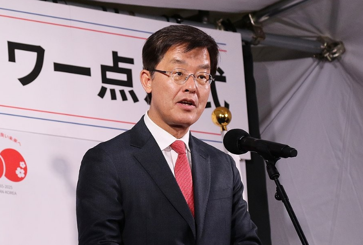 한일 국교정상화 60주년을 기념하는 점등식이 15일 일본 도쿄 미나토구 도쿄타워에서 열렸다. 이날 행사에는 박철희 주일 한국대사와 후나코시 다케히로 일본 외무성…