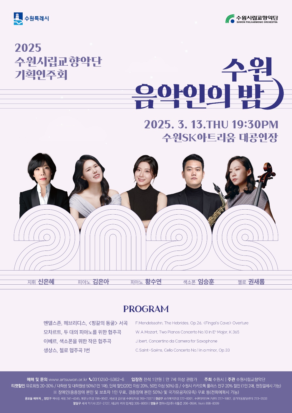 수원시립교향악단이 2025년 3월 13일 오후 7시 30분, 수원SK아트리움 대공연장에서 ‘수원 음악인의 밤’ 기획 연주회를 개최 했다. 이번 연주회는 지휘자 선은혜가…