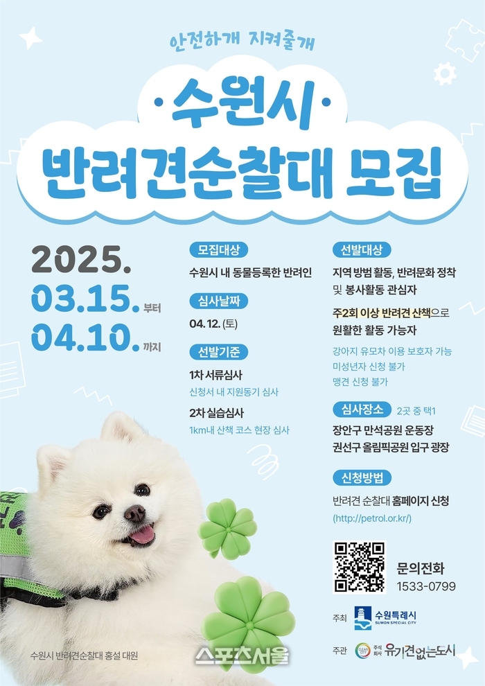 경기 수원시는 반려인과 반려견이 함께 순찰하는 ‘반려견 순찰대’의 신규 대원을 15일부터 4월 10일까지 모집한다. 지난해 10월 장안구에서 시범 운영된 반려견…