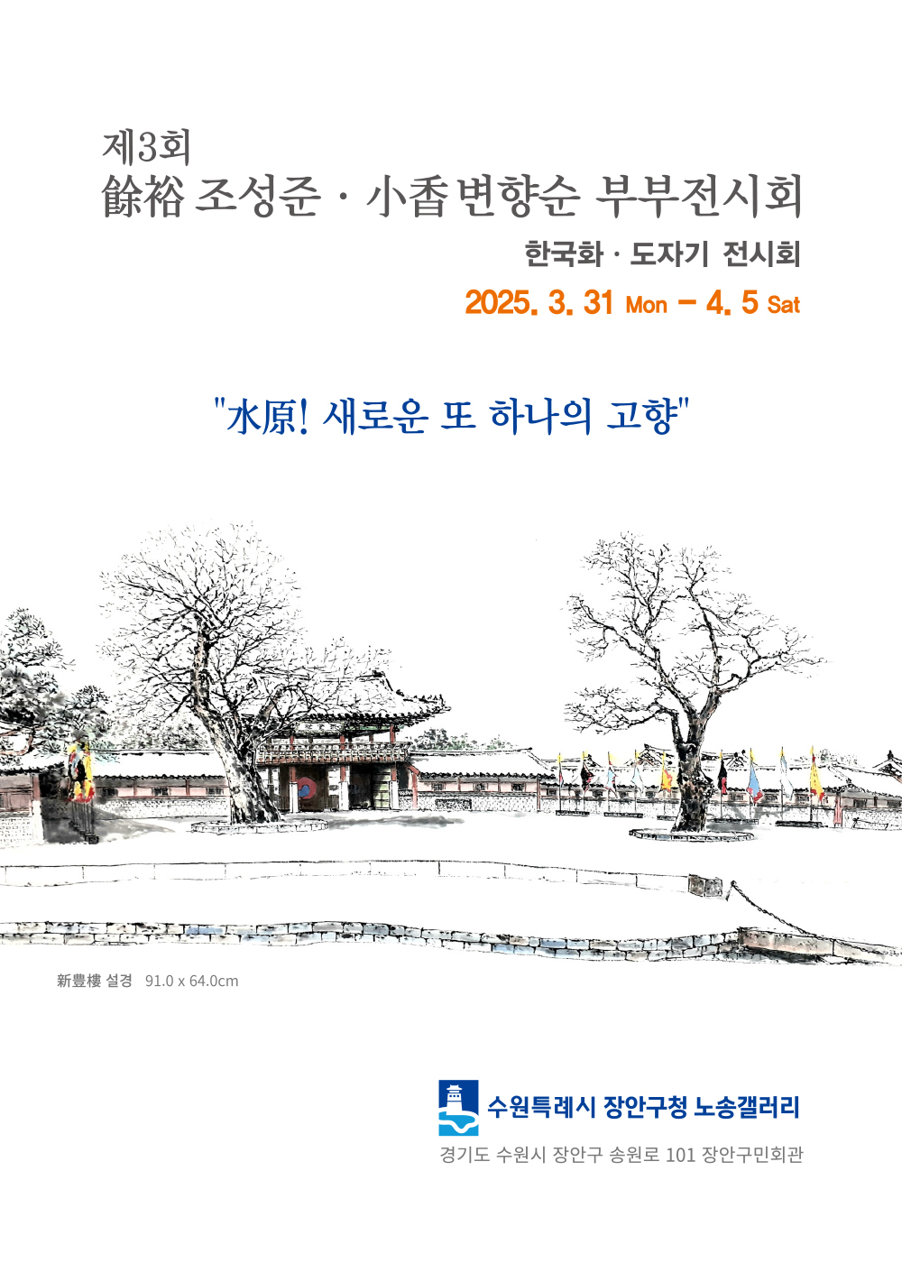 수원특례시 장안구청 노송갤러리에서 조성준·변향순 부부의 세 번째 합동 전시회가 열렸다. 전시는 3월 31일부터 4월 5일까지 6일간 진행되며, 한국화와 도자기 작품이…
