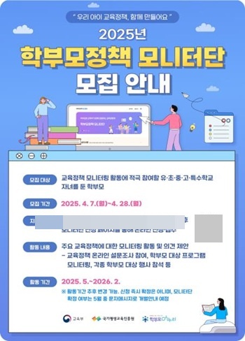 교육부와 국가평생교육진흥원이 4월 7일부터 28일까지 ‘2025년 학부모정책 모니터단’을 모집하고 있다. 모집 인원은 지난해보다 약 4천 명 늘어난 1만여 명으로 확대된다.…