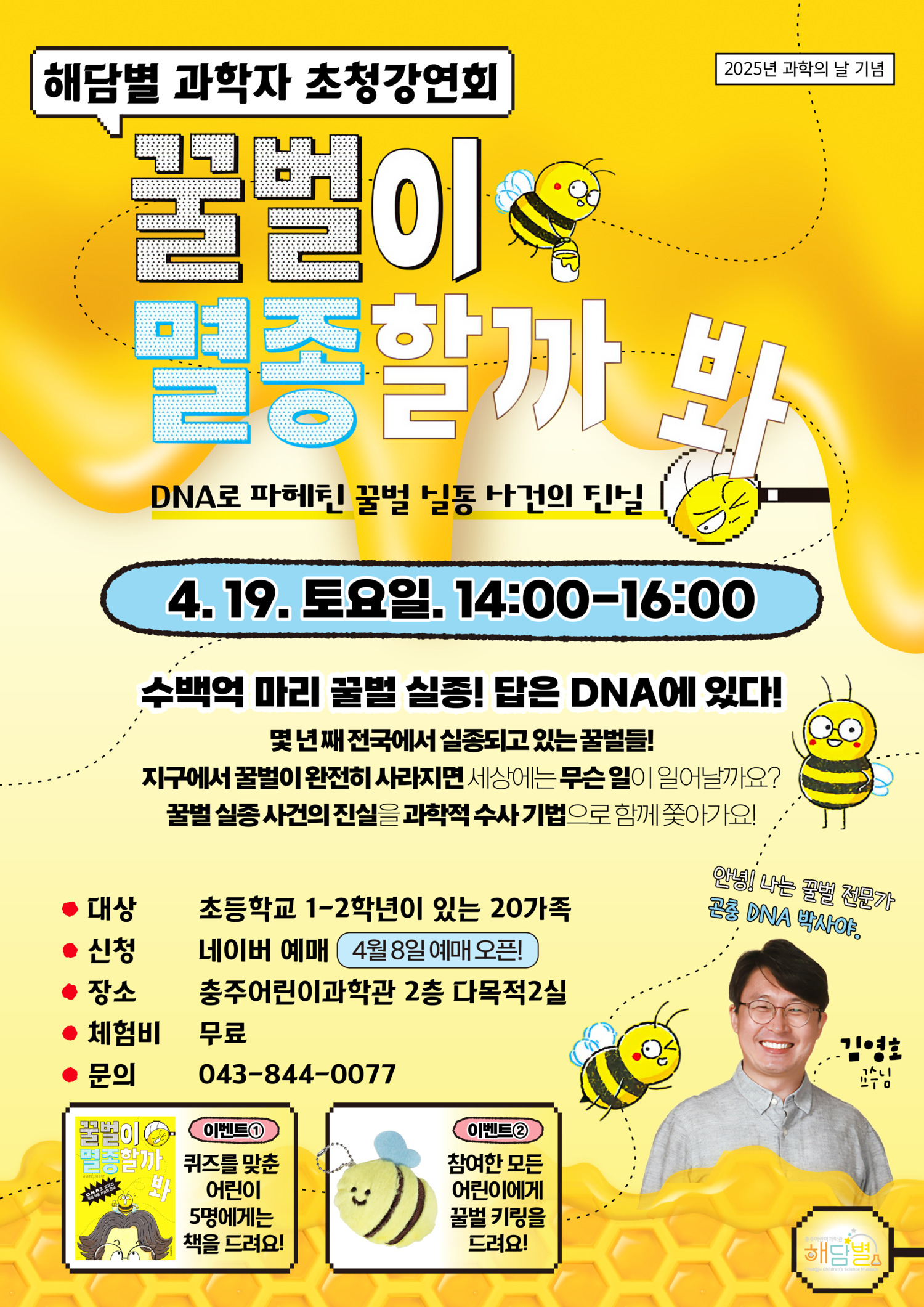 충북 충주어린이과학관이 제58회 과학의 날을 맞아 오는 19일 오후 2시 ‘해담별 과학자 초청강연회’를 개최한다. 이번 강연회에는 곤충 DNA 전문가이자 『꿀벌이…