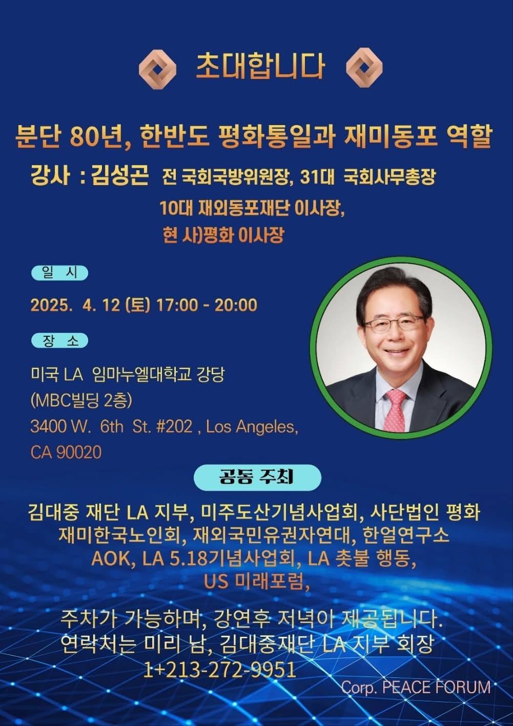 김성곤 전 국회 국방위원장(31대 국회사무총장)이 미국 로스앤젤레스에서 한반도 평화통일과 재외동포의 역할을 주제로 특별 강연을 진행한다. 이번 행사는 4월 12일(토) 오후…
