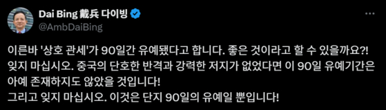 다이빙 주한중국대사가 미국의 90일 상호관세 유예 조치는 중국의 강경한 대응이 있었기에 가능했다고 주장했다. 특히 그는 이 같은 주장을 한국어로 직접…