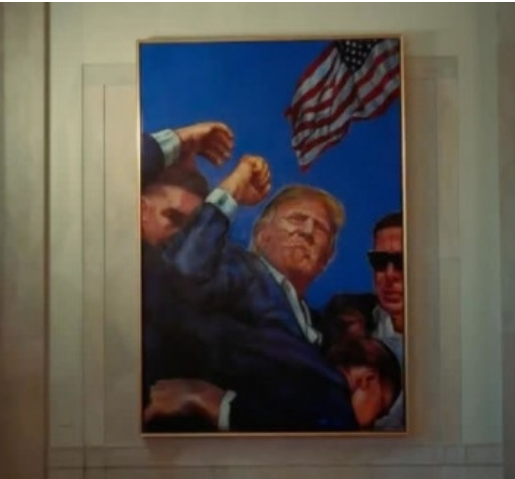 도널드 트럼프 미국 대통령이 피격 당시 주먹을 불끈 치켜든 장면이 백악관 공식 초상화로 그려져 전시됐다. 이 작품은 지난 12일(현지시간) 백악관…