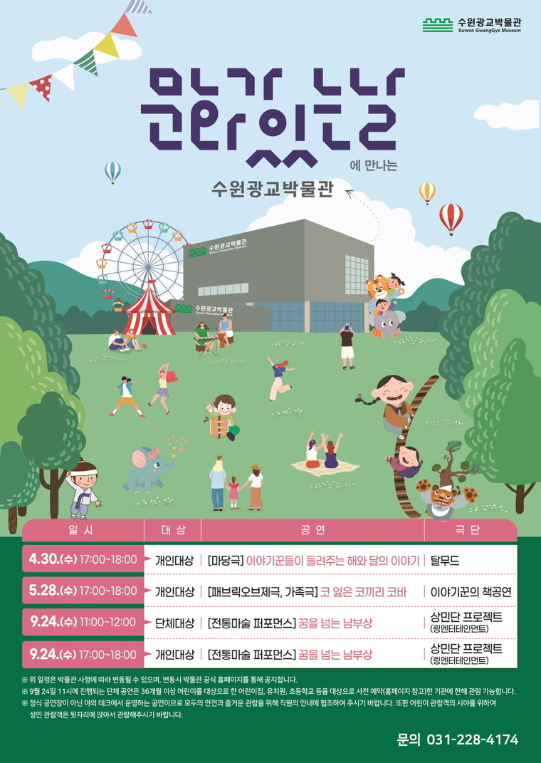 수원광교박물관이 ‘문화가 있는 날’을 맞아 어린이들을 위한 무료 공연을 선보인다. 박물관 측은 17일, 올해 4월·5월·9월의 마지막 수요일마다 박물관 야외 공간에서…