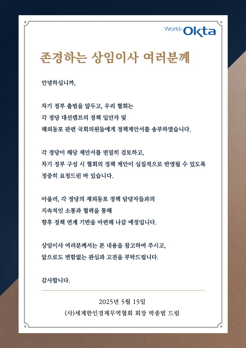 세계한인경제인무역협회(World-OKTA)는 15일 차기 정부 출범을 앞두고 각 정당 대선캠프와 국회의원들에게 정책 제안서를 송부했다고 밝혔다. 협회는 재외동포 관련 정책에 대한 입안자…