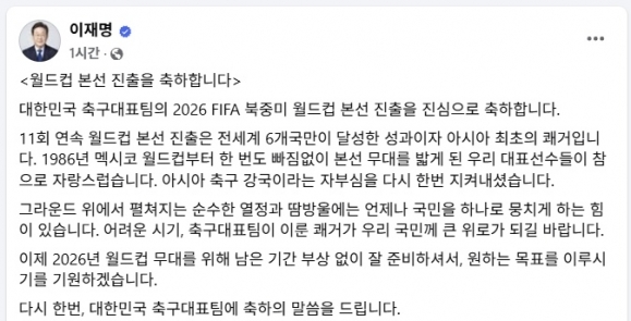 이재명 대통령이 취임 이틀 만인 6일 페이스북 활동을 재개하며 한국 축구 국가대표팀의 11회 연속 월드컵 본선 진출을 축하했다. 이 대통령은…
