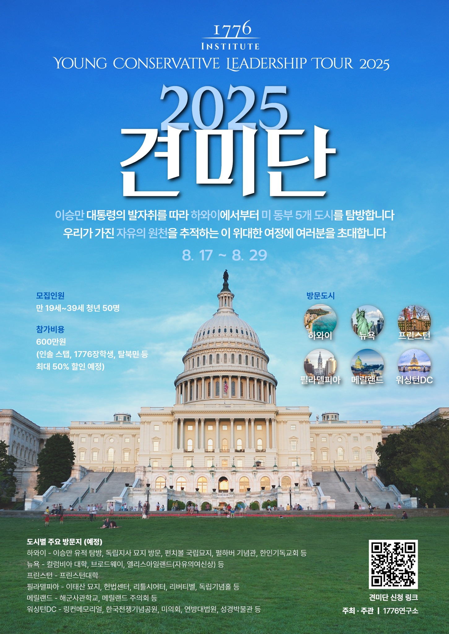 1776연구소가 대한민국 초대 대통령 우남 이승만의 발자취를 따라가는 청년 리더십 투어 ‘2025 견미단’의 2기 참가자를 모집한다. 견미단 프로그램은 만 19세에서…