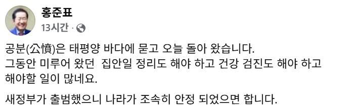 홍준표 전 대구시장이 17일 귀국 후 첫 심경을 밝혔다. 홍 전 시장은 이날 자신의 사회관계망서비스(SNS)에 올린 글에서 “공분(公憤)은 태평양 바다에…