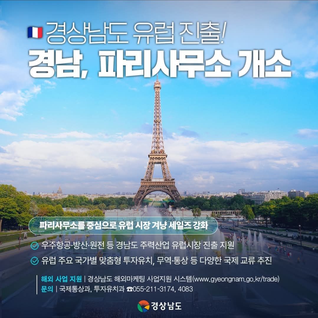 경상남도가 프랑스 파리에 국내 광역지자체 최초로 사무소를 열고 본격적인 유럽 시장 진출에 나섰다. 경상남도는 최근 프랑스 파리 근교 카샹에 ‘경남도…
