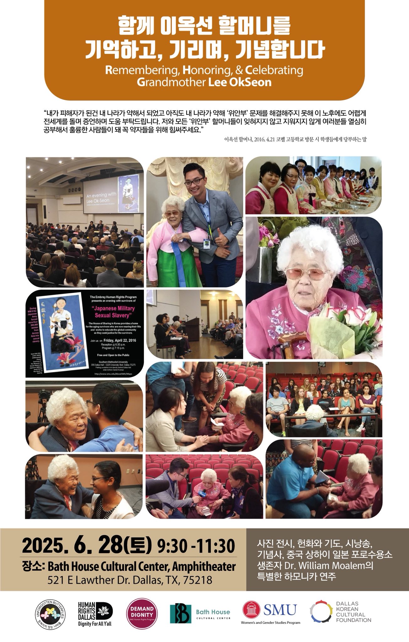 오는 6월 28일(토) 미국 텍사스주 댈러스의 배스하우스 문화센터(Bath House Cultural Center)에서 일본군 위안부 피해자 이옥선 할머니를 기억하고 기념하는 행사가 개최된다.…