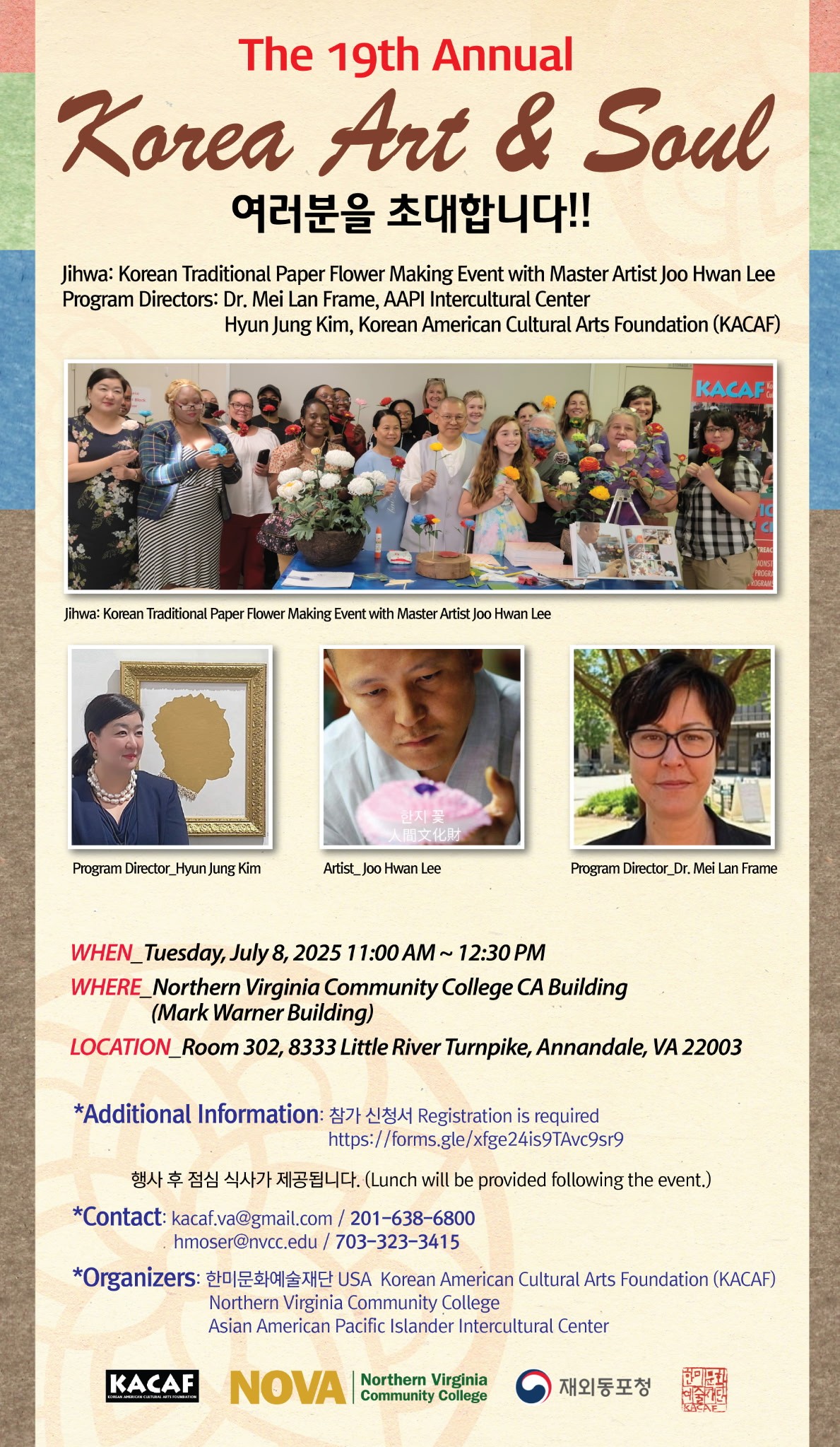 한미문화예술재단(KACAF)이 주최하는 제19회 ‘한국 예술의 혼(Korea Art & Soul)’ 행사가 오는 7월 8일(화) 오전 11시부터 오후 12시 30분까지 미국 버지니아주에…