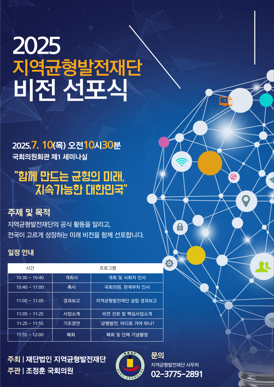 김기현 이사장이 이끄는 재단법인 지역균형발전재단(행정안전부 제1288호)이 오는 7월 10일 오전 10시 30분 국회의원회관 제1세미나실에서 ‘2025 지역균형발전재단 비전 선포식’을 개최한다. 이번…