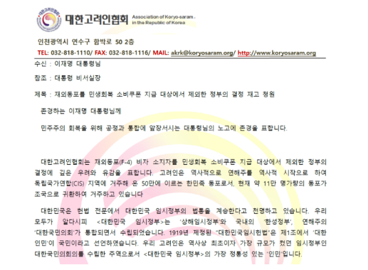 정부가 오는 7월 21일부터 지급하기로 한 ‘민생회복 소비쿠폰’ 대상에서 재외동포(F-4 비자) 소지자를 제외하기로 한 결정에 대해 대한고려인협회가 재고를 촉구하는 청원문을…