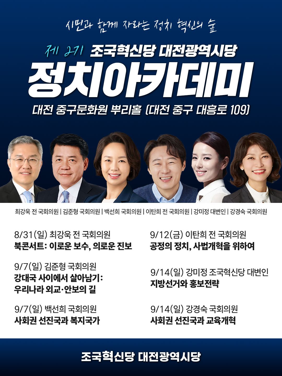 조국혁신당 대전시당이 정치 혁신을 주도할 제2기 정치 아카데미 수강생을 모집한다. 이번 아카데미는 지역 시민과 당원이 함께 참여해 ‘정치 혁신의 숲’을…