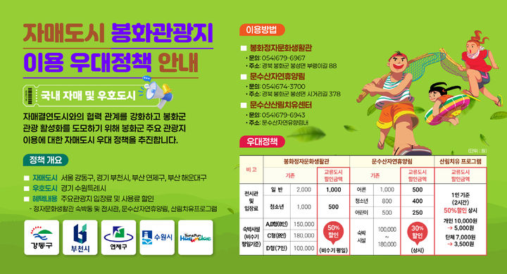 경기 수원시는 자매우호도시인 경북 봉화군의 주요 관광시설을 수원시민에게 반값 요금으로 제공한다고 18일 밝혔다. 수원시는 먼저 정자문화생활관 전시관 입장료를 기존 2천…