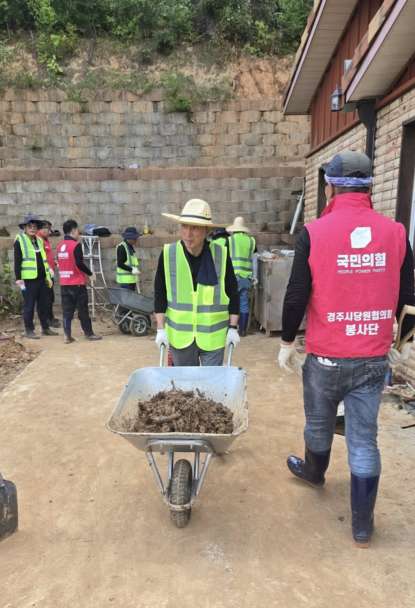 자유한국당 김석기 의원이 산청군 수해복구 현장 방문 당시 찍힌 사진 한 장이 온라인상에서 논란을 불러일으키고 있다. 26일 경북 경주 당협위원장이자…