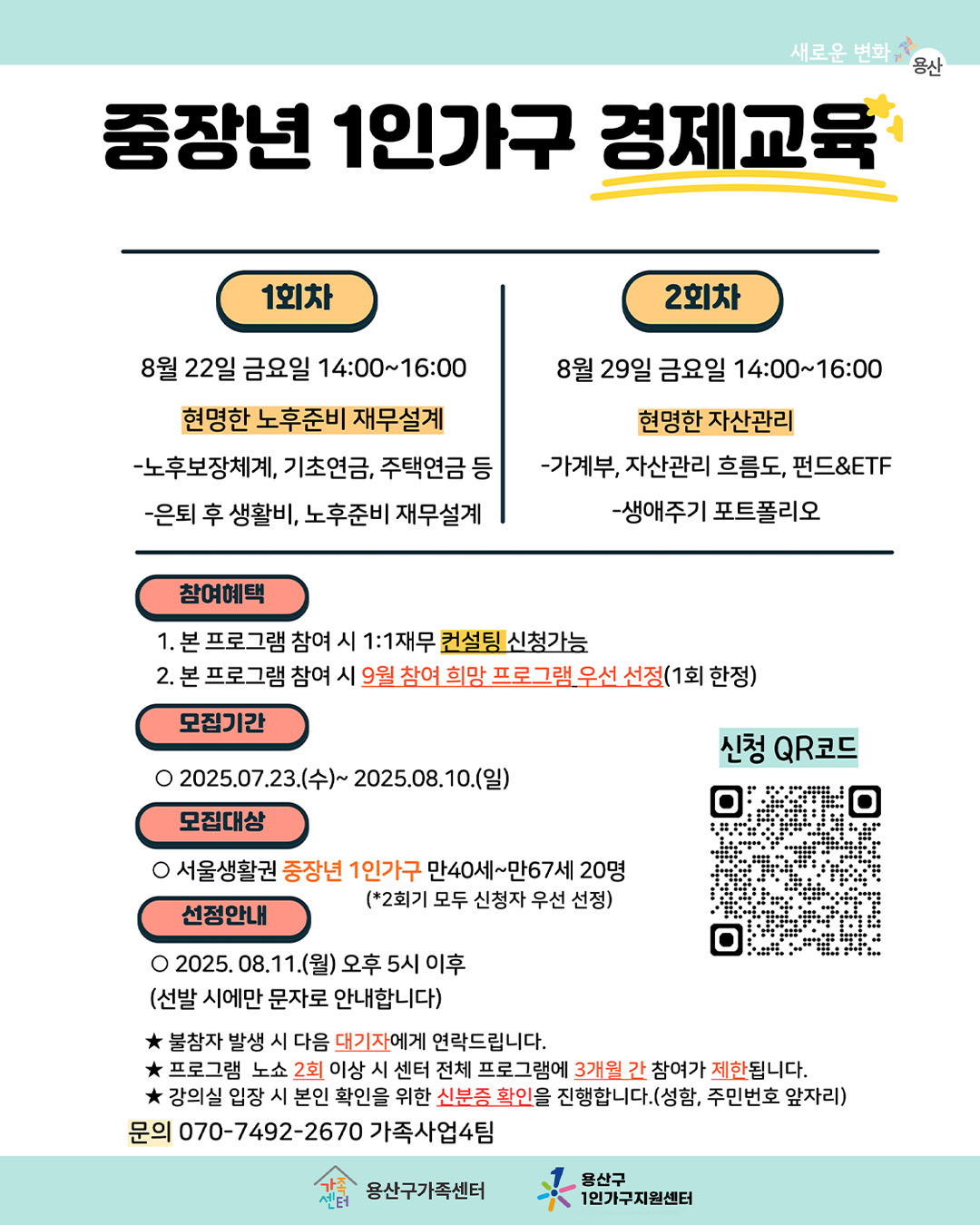 서울 용산구청이 중장년 1인가구를 위한 경제교육 프로그램 참여자를 모집한다. 이번 프로그램은 서울에 거주하거나 생활권이 있는 만 40세에서 67세 사이의 1인가구…