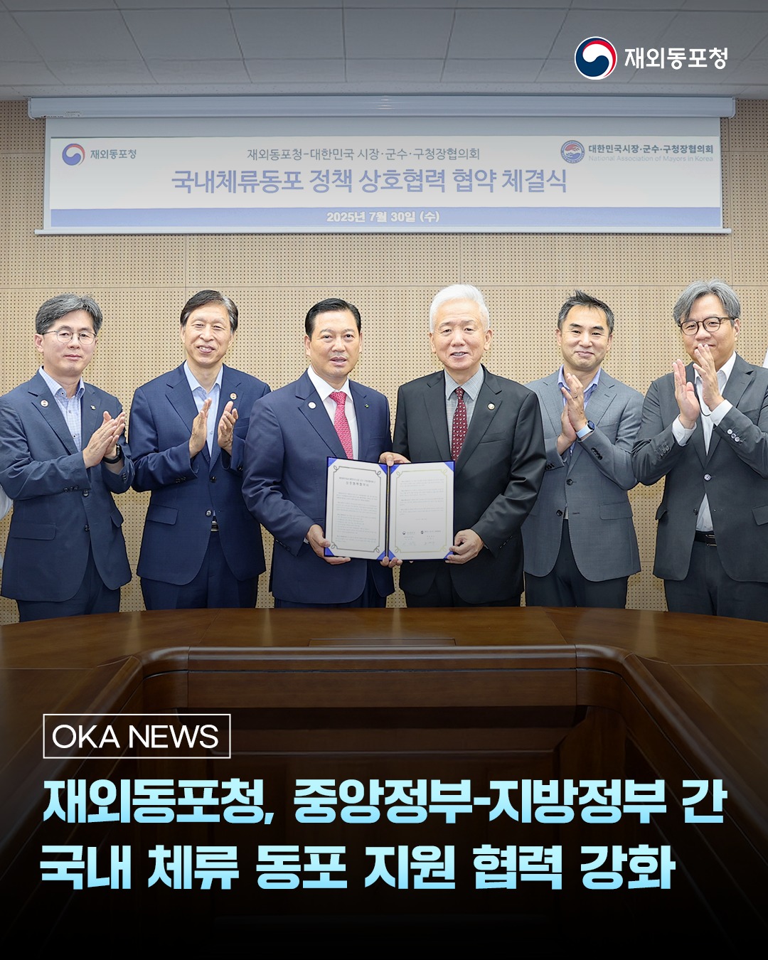 재외동포청이 7월 30일 수요일, 대한민국시장군수구청장협의회와 업무협약(MOU)을 체결하고 국내로 귀환하는 동포들의 안정적인 지역 정착을 위한 협력체계를 구축하기로 했다. 이번 협약은 귀환…