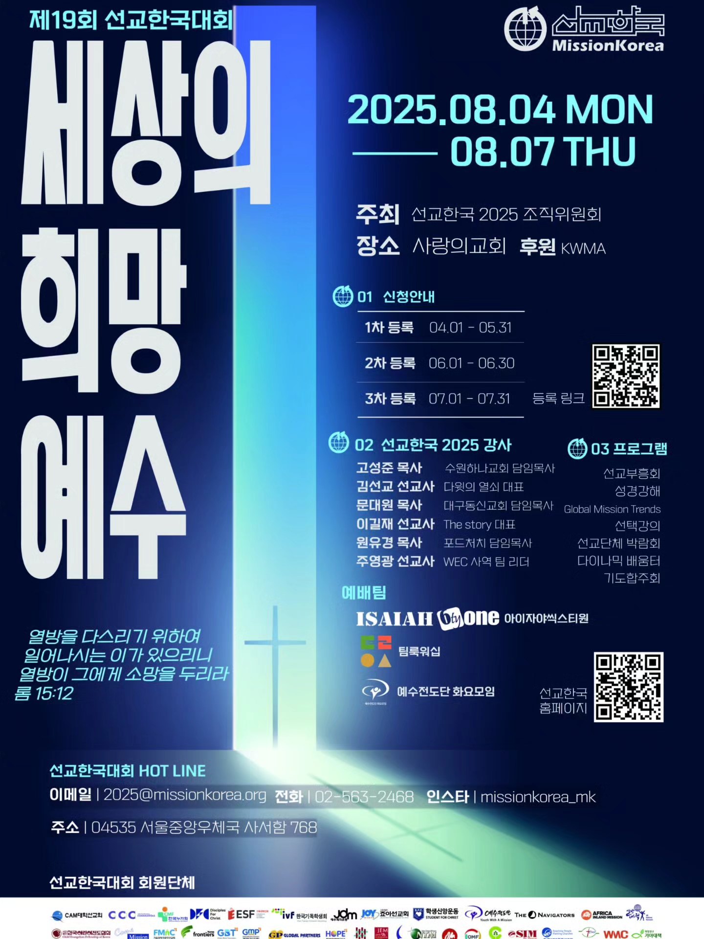 선교한국 2025 조직위원회가 주최하는 제19회 선교한국대회가 오는 8월 4일부터 7일까지 사랑의교회에서 열린다. 이번 대회는 ‘세상의 희망 예수’를 주제로 진행되며, 한국세계선교협의회(KWMA)가…
