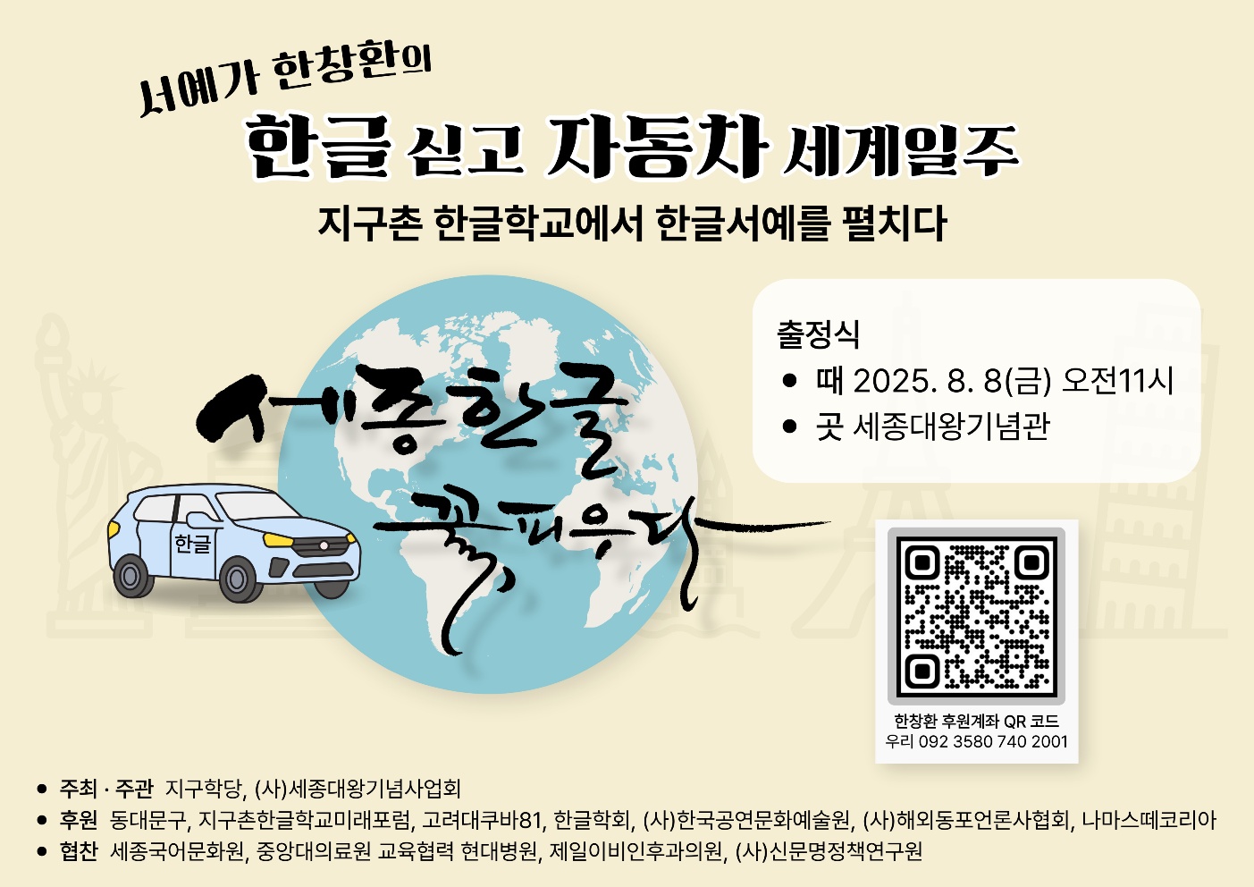 2025년 8월 8일 오전 11시, 서울 동대문구 회기로에 위치한 세종대왕기념관에서 ‘한글 사랑·평화 사랑’을 모토로 하는 자동차 세계일주 출정식이 열린다. 이번…