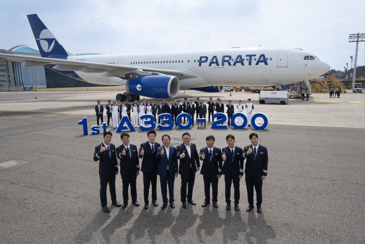 파라타항공이 8월 2일 김포국제공항에서 첫 번째 A330-200 기체 도입식을 열었다. 윤철민 대표와 위닉스 윤희종 회장, 도입 비행팀 기장 등 임직원이…