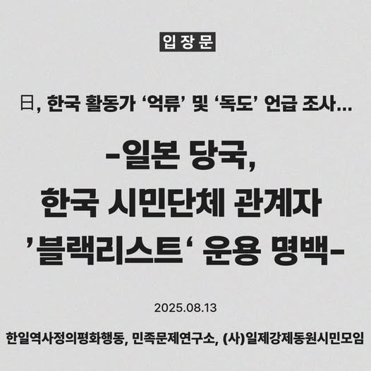 한국 활동가 ‘억류’ 및 ‘독도’ 언급 조사… -일본 당국, 한국 시민단체 관계자 ’블랙리스트‘ 운용 명백- 지난 7일 오후 (사)일제강제동원시민모임 이국언…