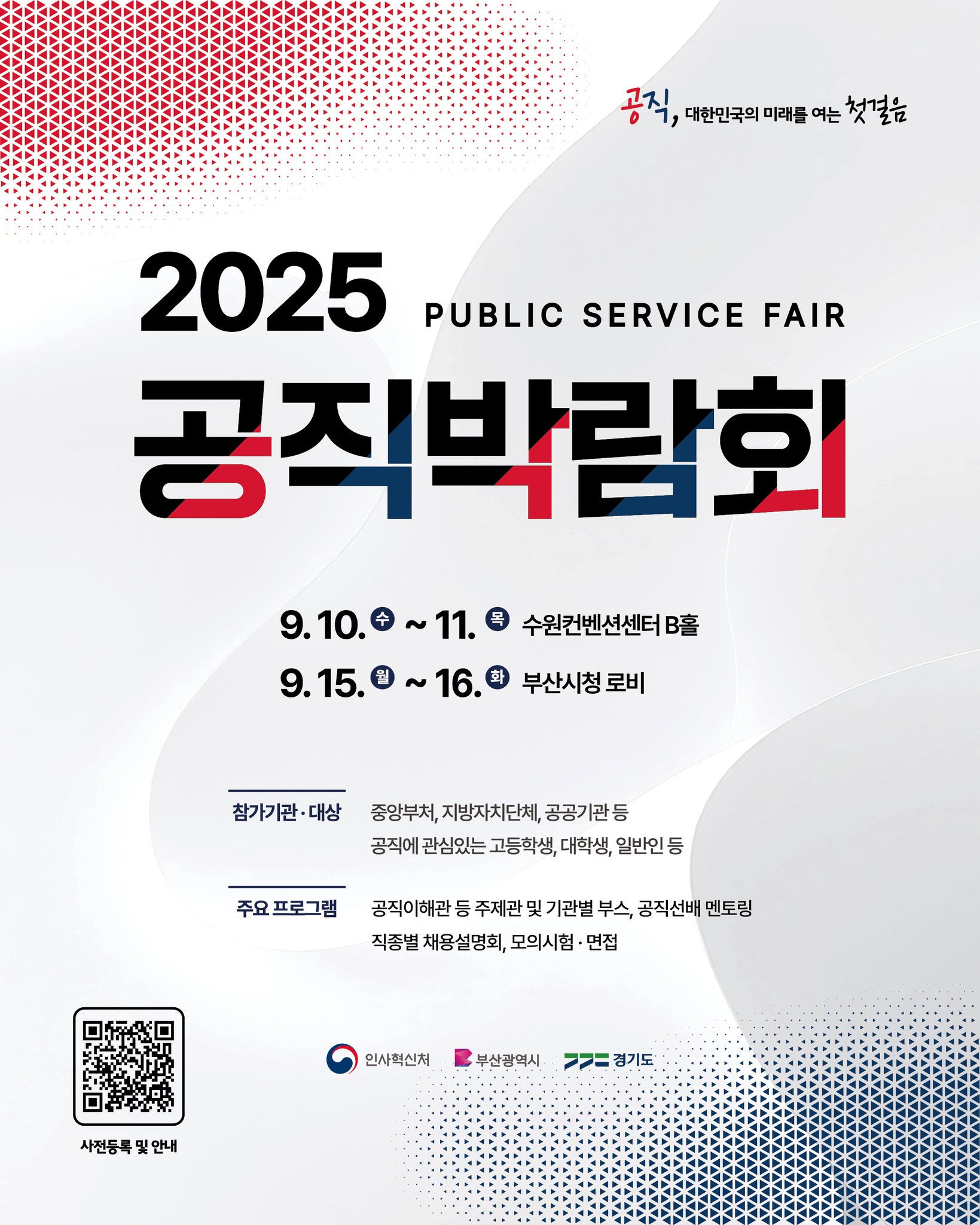 인사혁신처가 오는 9월 경기와 부산에서 ‘2025 공직박람회’를 개최한다. 이번 행사는 중앙부처, 지방자치단체, 공공기관 등이 참여해 공직에 관심 있는 고등학생, 대학생,…