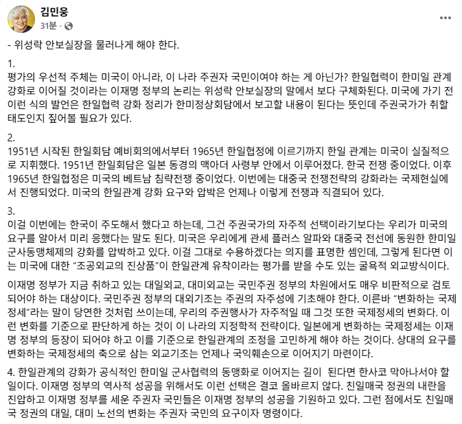 김민웅 전 경희대 교수(정치학)는 최근 위성락 국가안보실장의 발언을 정면 비판하며, 이재명 정부의 대외정책 기조에 근본적 전환이 필요하다고 주장했다. 김 교수는…