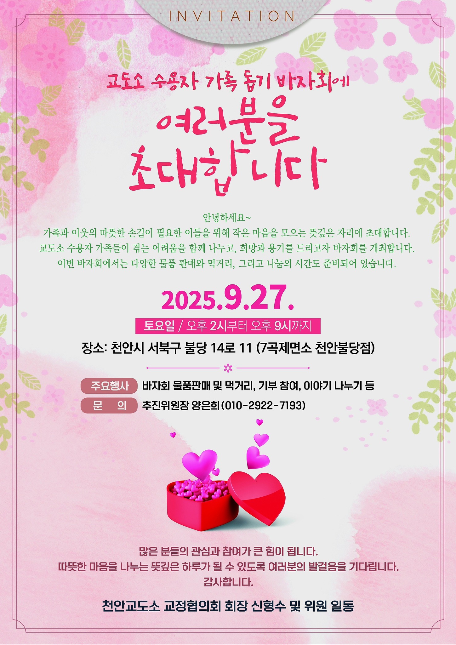 교도소 수용자 가족들의 생활 안정을 지원하기 위한 바자회가 오는 9월 27일 토요일 오후 2시부터 오후 9시까지 천안시 서북구 불당동 7곡제면서…