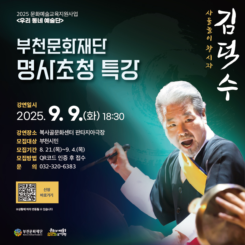 부천문화재단이 주최하는 2025 문화예술교육지원사업 ‘우리 동네 예술단’의 일환으로 사물놀이 창시자인 김덕수 명인을 초청한 특강이 열린다. 이번 강연은 오는 9월 9일…