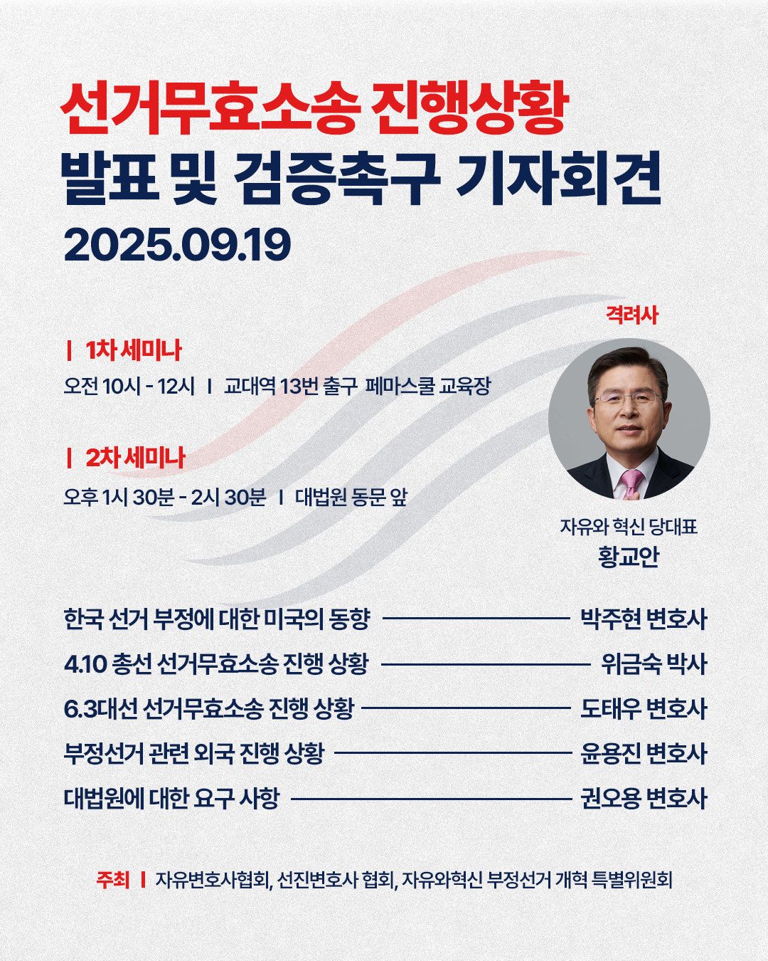 2025년 9월 19일, 자유와혁신당과 법조계 인사들이 참여한 선거무효소송 관련 기자회견이 서울에서 열렸다. 이번 회견은 교대역 인근과 대법원 앞 두 차례…